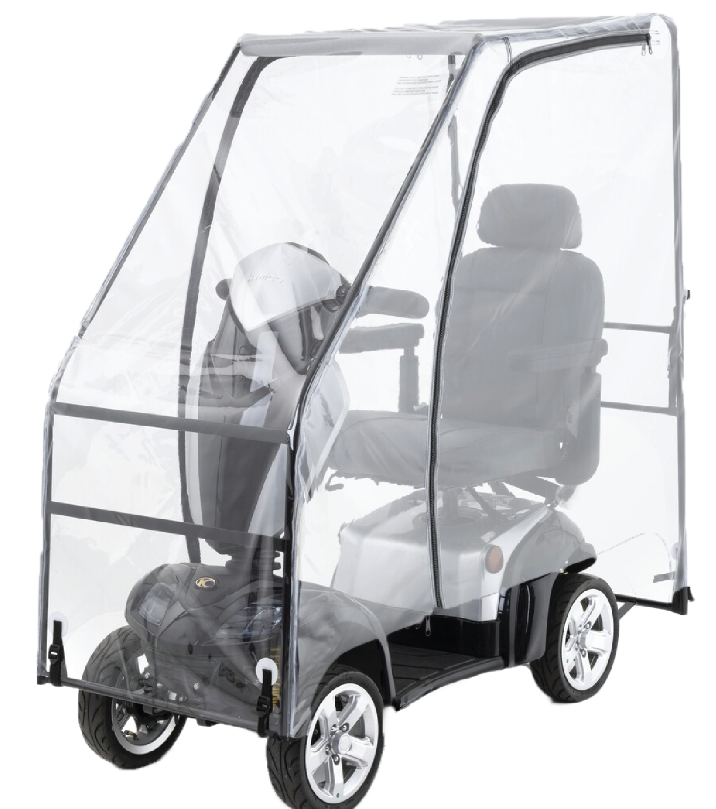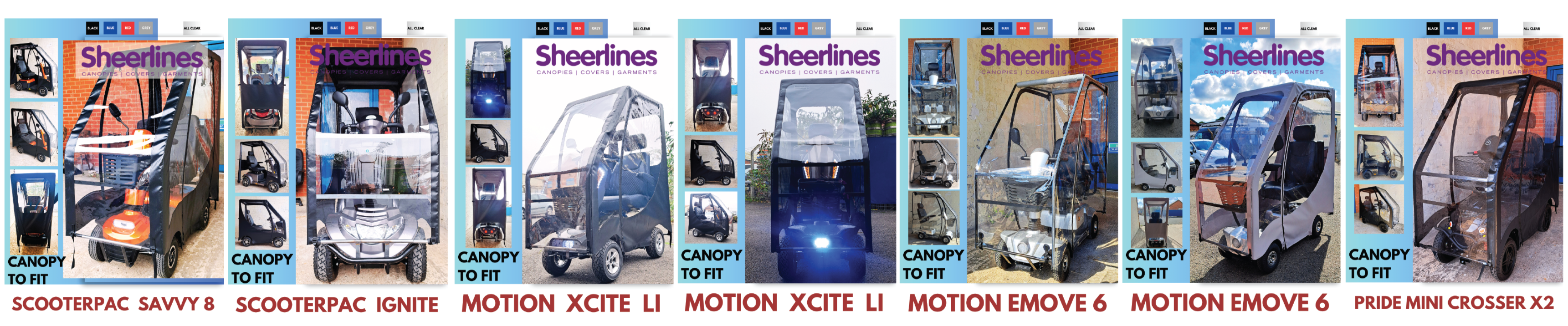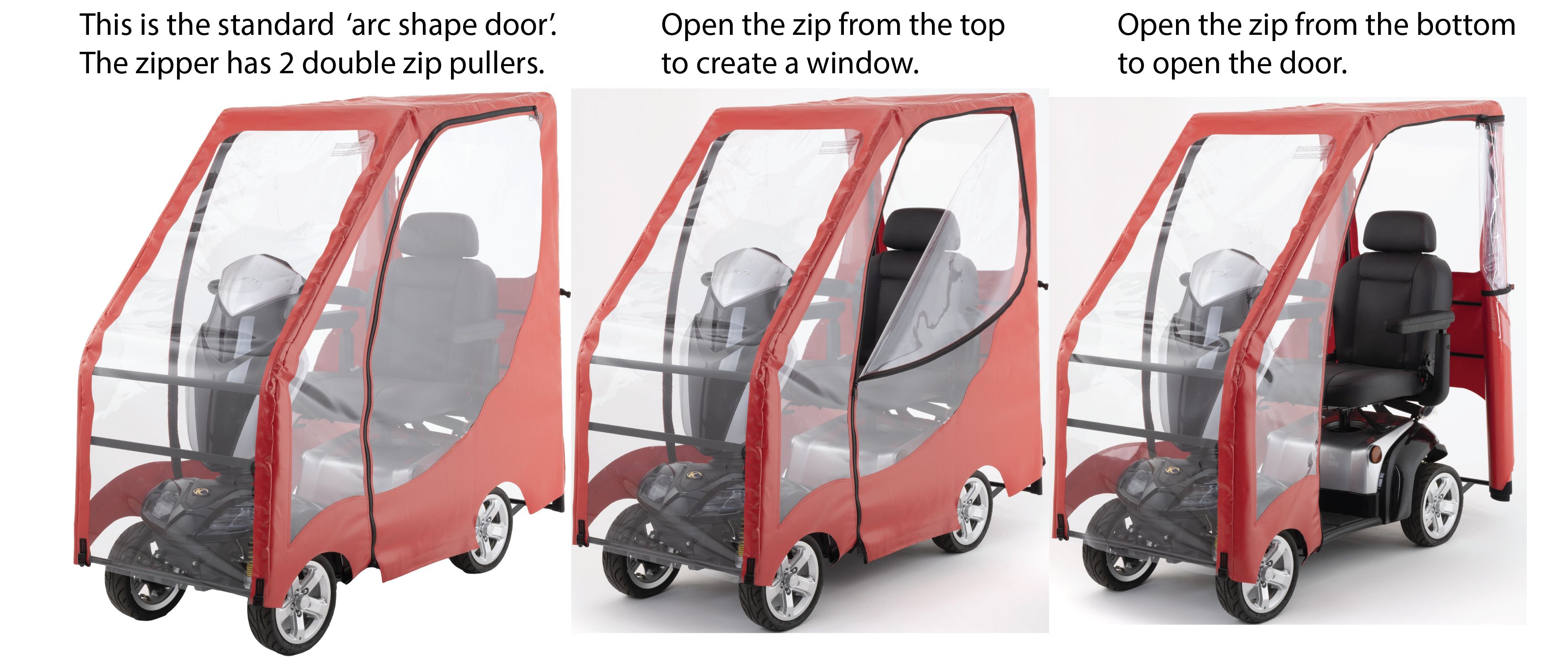We offer four canopy models: SC1 and SC2, each in Standard (coloured) and Deluxe (all clear) versions. All are custom-fit to your scooter model and share the same clear windows and zipped door design. SC2 has shorter doors, and the Deluxe models are offer more visibility. Installation takes about 30–40 minutes. Still unsure? We’re happy to help you pick the right one.