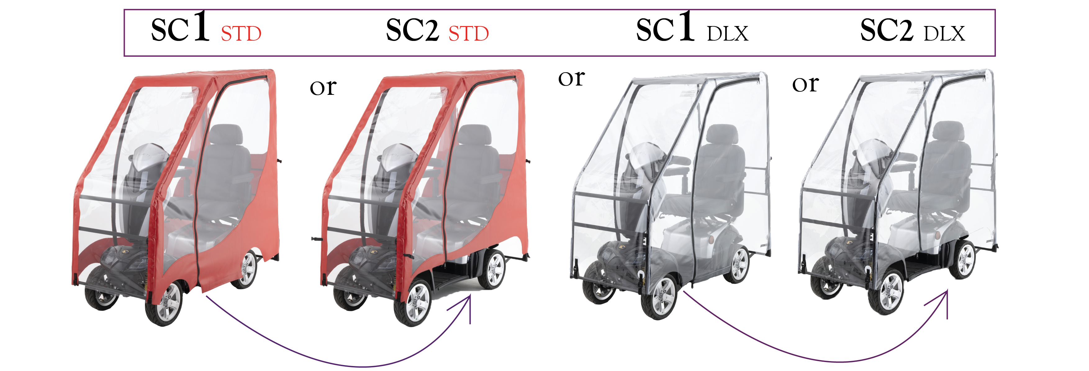 Choosing a mobility scooter canopy shouldn’t feel overwhelming. We keep it simple: four main types—SC1 Standard, SC1 Deluxe, SC2 Standard, and SC2 Deluxe—each tailored to different needs and weather conditions.