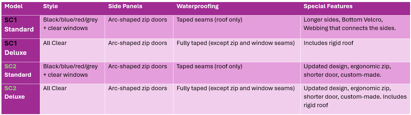 All the design improvements from the SC2 Standard, plus the rigid white polycarbonate roof, included. Fully clear sides, same zipped arc-shaped doors, same quick-access top window, and shorter sides. Like the SC1 Deluxe, this version is nearly 100% waterproof.